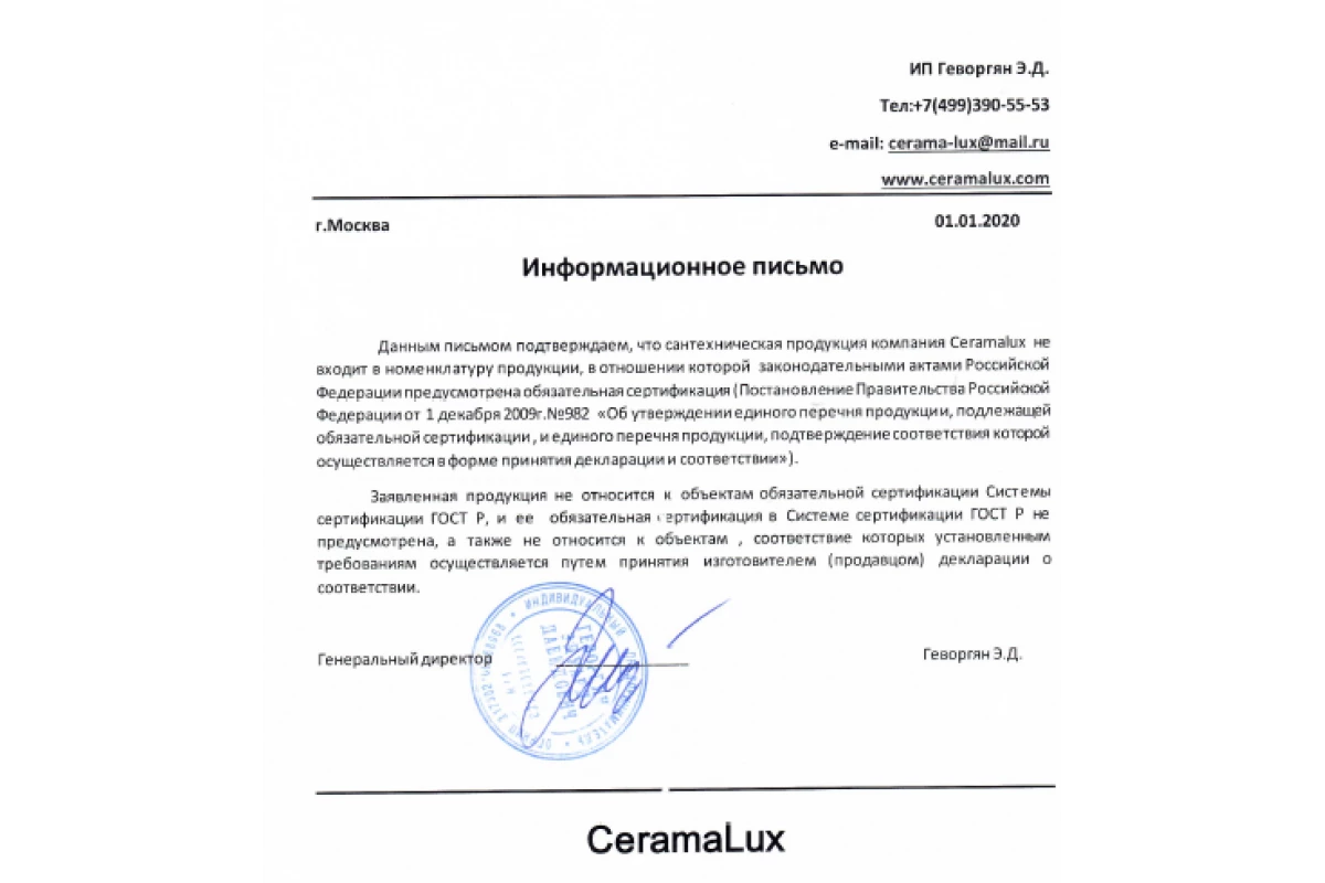 Ceramalux - письмо о сертификации